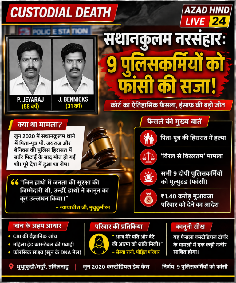 - कस्टोडियल डेथ केस में इंसाफ की बड़ी जीत: सथानकुलम मामले में 9 पुलिसकर्मियों को फांसी