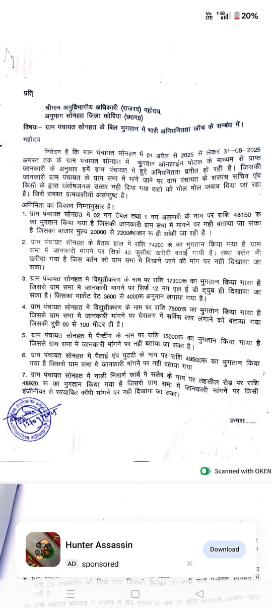 पंचों ने बताया कि 01 04 2025 से लेकर 31-08-2025 अगस्त तक के ग्राम पचायत सोनहत में भुगतान ऑनलाईन पोटल के माध्यम से जानकारी मिली जानकारी के अनुसार ग्राम पंचायत सोनहत मे अनियमितता प्रतीत हो रही है।