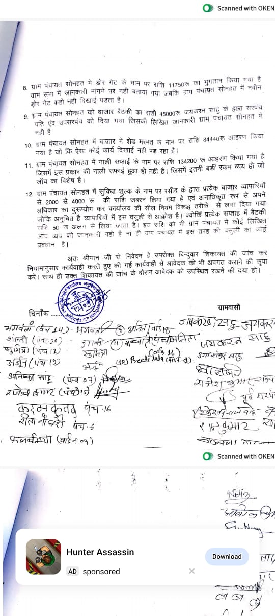 . ग्राम पंचायत सोनहत में सुविधा शुल्क के नाम पर रसीद के द्वारा प्रत्येक बाजार व्यापारियों से 2000 से 4000 रू की राशि जबरन लिया गया है एवं अनाधिकृत रूप से अपने अधिकार का दुरूप्योग कर कार्यालय की सील नियम विरूद्ध तरीके से लगा दिया गया जोकि अनुचित है व्यापारियों में इस वसुली से आक्रोश है।