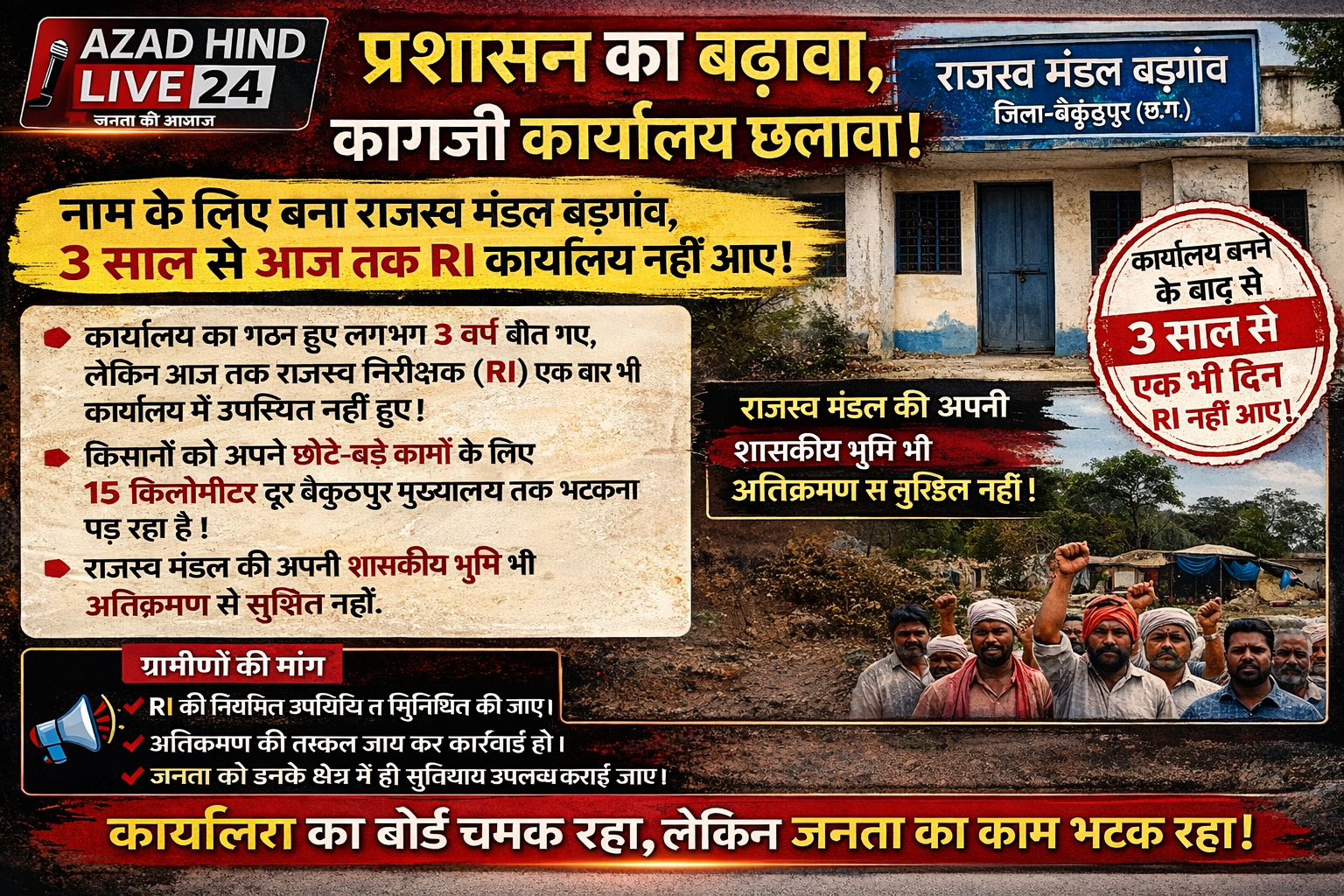 कोरिया/ बड़गांव क्षेत्र में प्रशासनिक व्यवस्था को लेकर गंभीर सवाल खड़े हो रहे हैं। राजस्व मंडल बड़गांव, जिसे ग्रामीणों और किसानों की सुविधा के लिए स्थापित किया गया था, आज सिर्फ कागजों में सीमित कार्यालय बनकर रह गया है। स्थानीय लोगों का आरोप है कि कार्यालय बनने के बाद से पिछले लगभग 3 वर्षों में आज तक राजस्व निरीक्षक (RI) एक बार भी कार्यालय नहीं आए हैं। यह स्थिति बताती है कि यह कार्यालय केवल नाम के लिए राजस्व मंडल बनाकर छोड़ दिया गया है, जिससे क्षेत्र के कई ग्राम पंचायतों के किसानों और आम नागरिकों को भारी परेशानियों का सामना करना पड़ रहा है।
