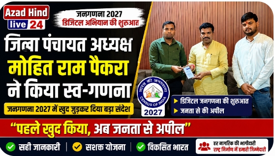 नमस्कार , हमारे न्यूज पोर्टल - मे आपका स्वागत हैं ,यहाँ आपको हमेशा ताजा खबरों से रूबरू कराया जाएगा , खबर ओर विज्ञापन के लिए संपर्क करे 8103696901 , 6266418989 , 6266256782 , 8226053208 ,हमारे यूट्यूब चैनल को सबस्क्राइब करें, साथ मे हमारे फेसबुक को लाइक जरूर करें , देश में डिजिटल जनगणना 2027 की शुरुआत, जिला पंचायत अध्यक्ष मोहित राम पैकरा ने की स्व-गणना — नागरिकों से बढ़-चढ़कर भागीदारी की अपील – Azad Hind Live24